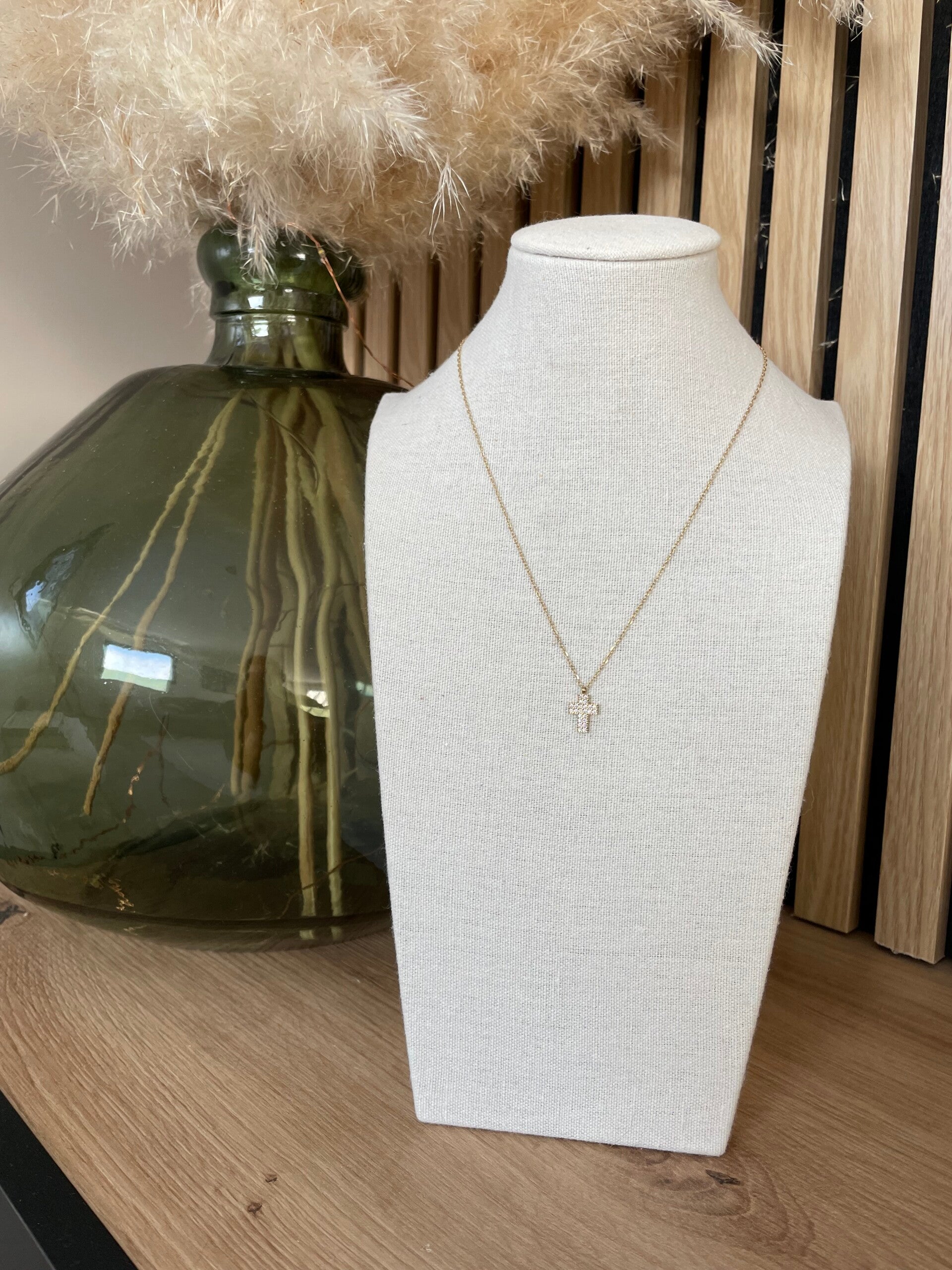 Ce délicat collier est orné d’un pendentif en forme de croix en acier doré, serti de strass taille brillant qui captent magnifiquement la lumière.