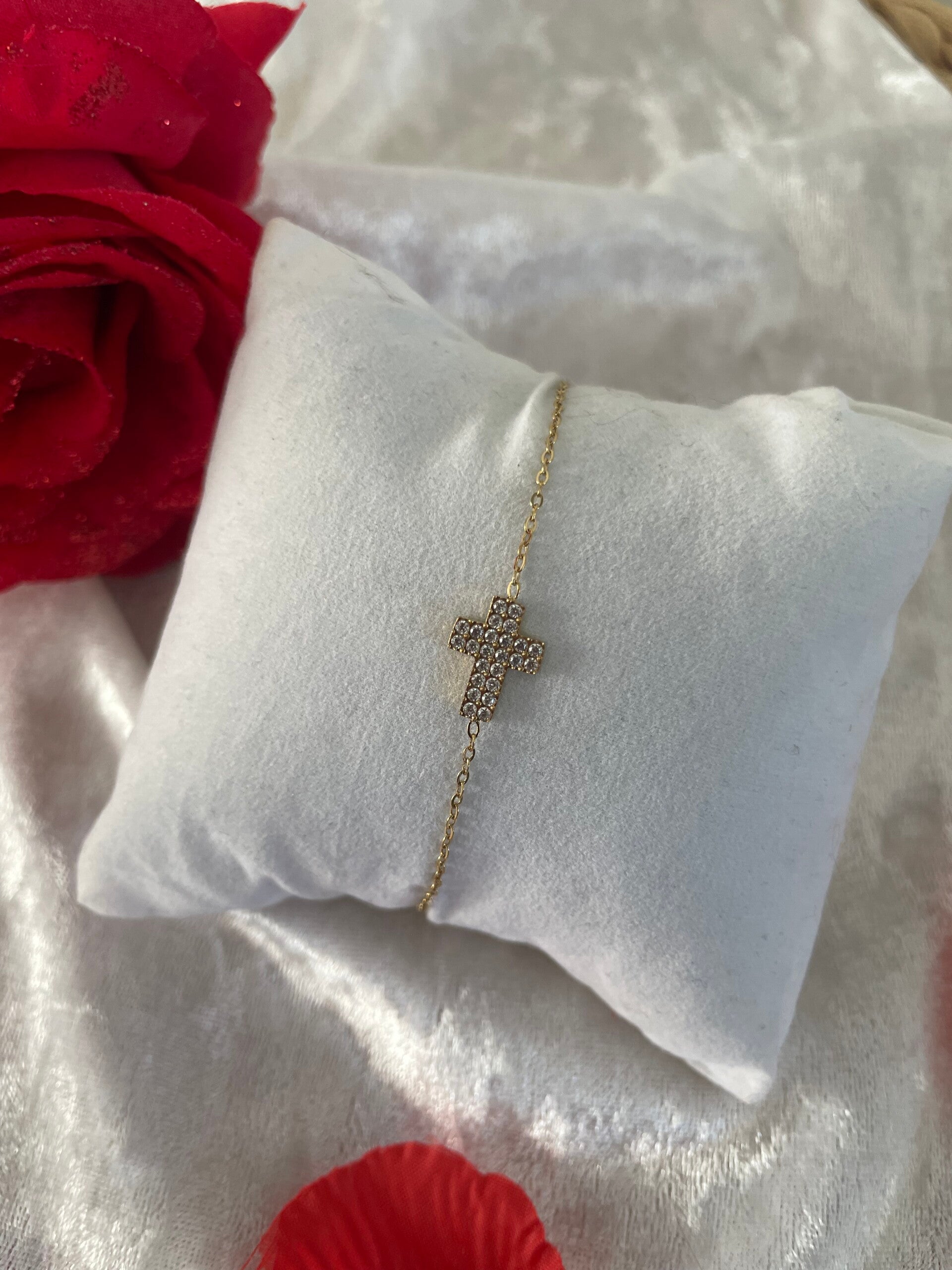 Sa croix délicatement sertie de strass taille brillant capte magnifiquement la lumière, apportant une touche lumineuse et raffinée à votre poignet.