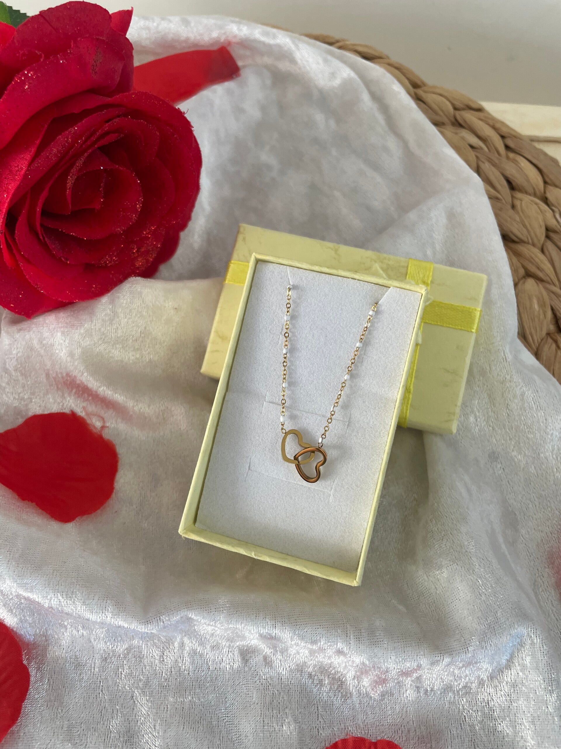 Laissez-vous séduire par ce bracelet raffiné en acier doré, sublimé par de délicates perles en émail blanc et une paire de cœurs entrelacés, symboles d’union et de tendresse.