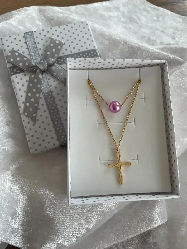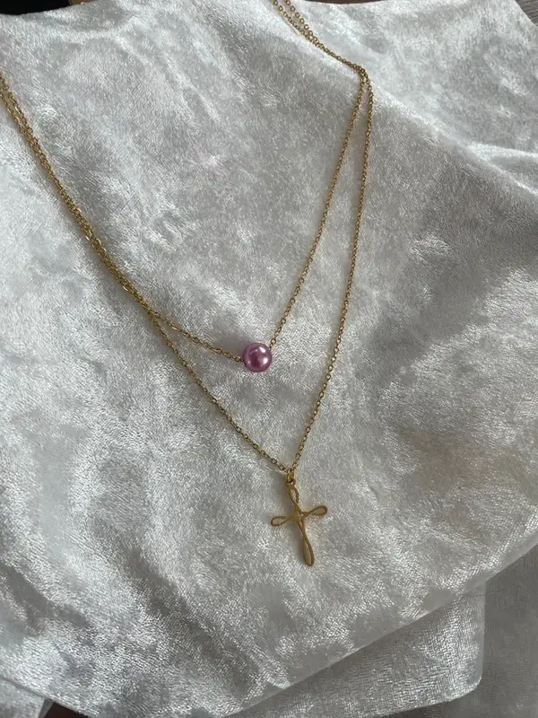 Collier double rang croix chrétienne en acier inoxydable doré et perle